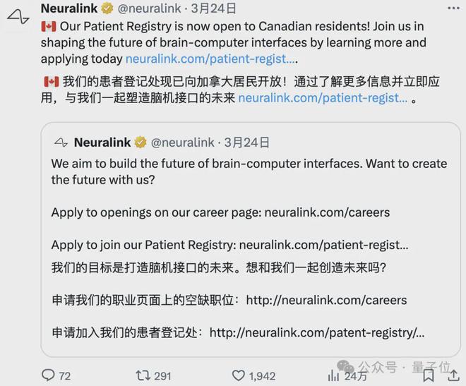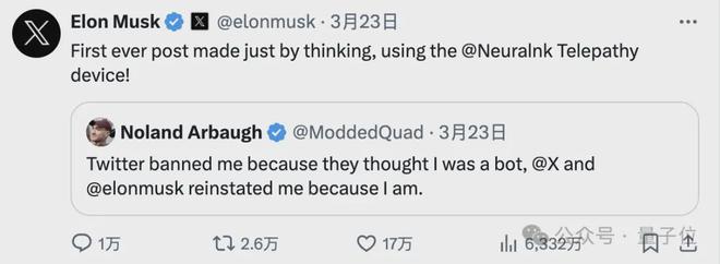 在这场内部会议上,他也谈论了自己的感受。 他称自己以前在操作ipad等电子产品时,就是嘴里叼一根棒子(mouth stick)来进行,但时间久了很累甚至会产生痉挛。 现在有了脑机接口,他直接打一宿游戏都不累(旺柴),这真正改变了他的生活。 首条推特“闹乌龙” 几天前,Noland Arbaugh正式用意念控制发布了他的第一条推特(马斯克也转发了)。 在推文中,他称一开始(由于意念操作)还被平台判定为机器人,然后就被禁了。 最终还是马斯克帮他解的封。 不过对此,他似乎倒是“毫不在意”,称自己就是一个不折不扣的机器人。 ——这不,在Neuralink内部会议亮相时,他开口的第一句就“搞事”: Hello, Humans。 当然,后面阿堡解释:自己和大伙没什么两样,只不过带一点硬件,多一点计算能力啦。 OMT 这两天,Neuralink又开始大力招志愿者了,范围也从美国扩展到了加拿大。 同时,也开启了一大波招聘:从工程师到运营,啥都要。 马斯克的脑机接口公司,接下来还会给我们带来怎样的惊喜? 参考链接: 转自网易号https://www.163.com/dy/article/IU75ESGE0511DSSR.html?spss=dy_author 该文章在 2024/3/28 10:06:14 编辑过 |