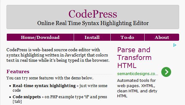 CodePress 是个基于 web 的源代码编辑器,当在浏览器中编写 JavaScriptis 代码的时候能实时的进行代码高亮。