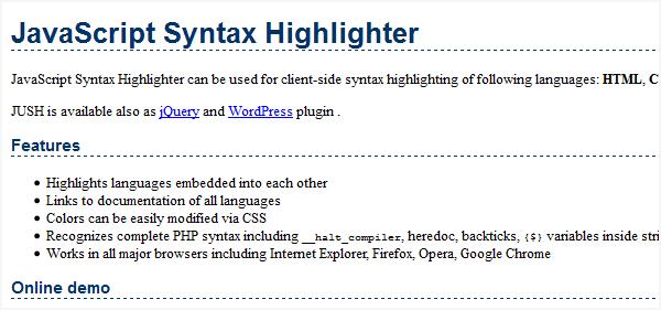 JavaScript Syntax Highlighter 是个客户端代码高亮工具,支持的语言有:HTML, CSS, JavaScript, PHP, SQL, HTTP 和SMTP 协议, php.ini 和 Apache 配置,支持所有主流的浏览器: Internet Explorer, Firefox, Opera and Google Chrome。JUSH 同时也是个 jQuery 和 WordPress 插件。