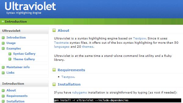 Ultraviolet 是个基于 Textpow 的代码语法高亮引擎。自从使用了 Textmate 语法高亮文件,就能支持超过 50 中语言的语法高亮显示和 20 种不同的主题,而且是开箱即用哦。