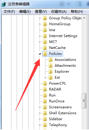 3、我们进入到注册表界面,依次展开到【HKEY_CURRENT_USER\Software\Microsoft\Windows\CurrentVersion\Policies】项下。