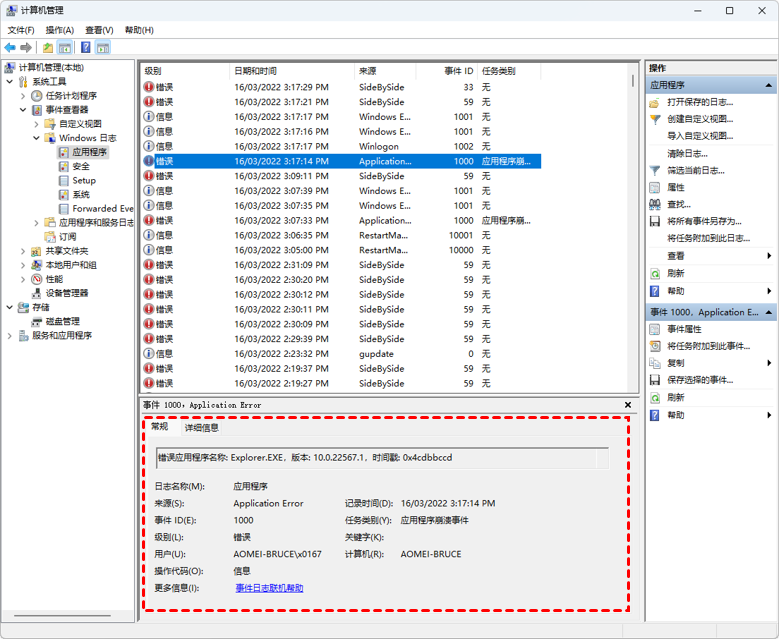 1. 右键点击桌面“我的电脑”或搜索“计算机管理”,在左侧点击“事件查看器”