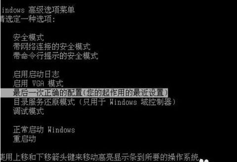 重新启动,在重启的时候按“F8”进入高级选项。上下移动箭头选择到“最后一次正确配置”。选择这个功能会让你的电脑回到上一次正确启动的时候,还原你的错误操作。注意,这个功能会丢失上次启动后保存的数据。