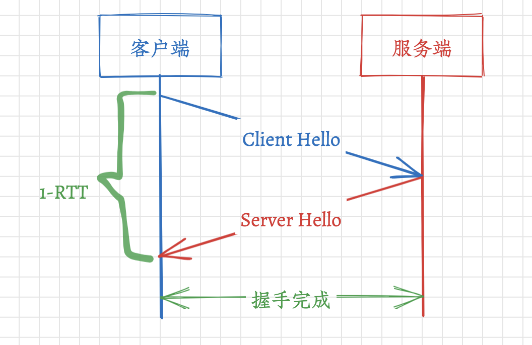 正是因为这样,所以,QUIC 建立连接的过程就是 TLS 建立连接的过程,如下图这样,首次建立连接只需要 1-RTT。