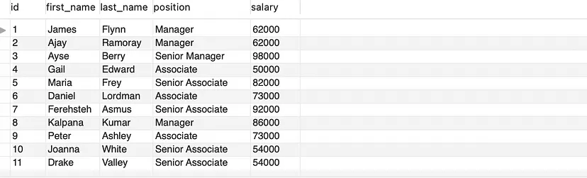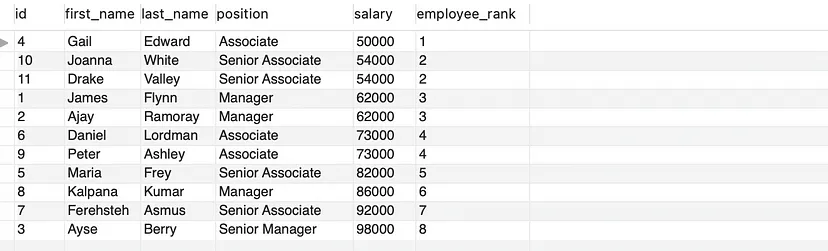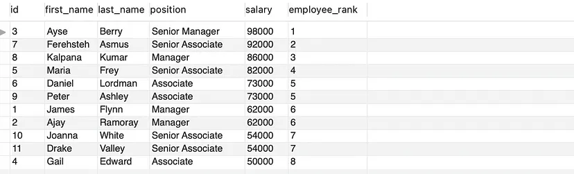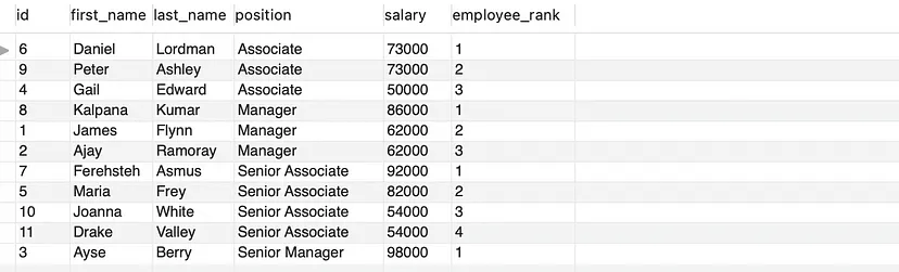 • 让我们根据员工的薪资从高到低排序,并为薪资相同的行分配相同的排名。然后根据“职位(position)”列将结果集分成若干分区。