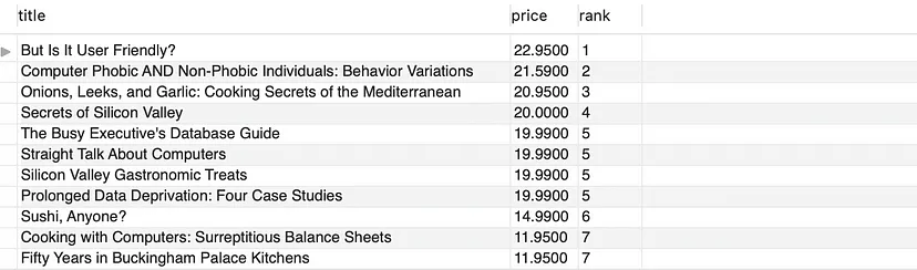 SELECT title, price, DENSE_RANK() OVER(ORDER BY price DESCas 'rank'