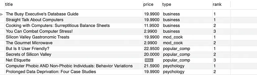 SELECT title, price, typeDENSE_RANK() OVER(PARTITION BY type ORDER BY price DESCas 'rank'