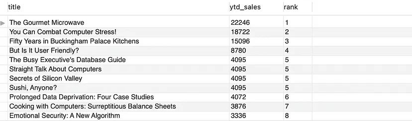 SELECT title, ytd_sales, DENSE_RANK() OVER(ORDER BY ytd_sales DESCas 'rank'