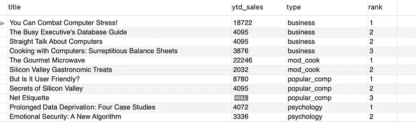 SELECT title, ytd_sales, typeDENSE_RANK() OVER(PARTITION BY type ORDER BY ytd_sales DESCas 'rank'