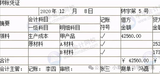 【例】2020年12月8日,车间生产甲产品领用A材料350公斤,单价72元,领用B材料560公斤,单价31元。