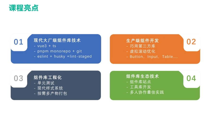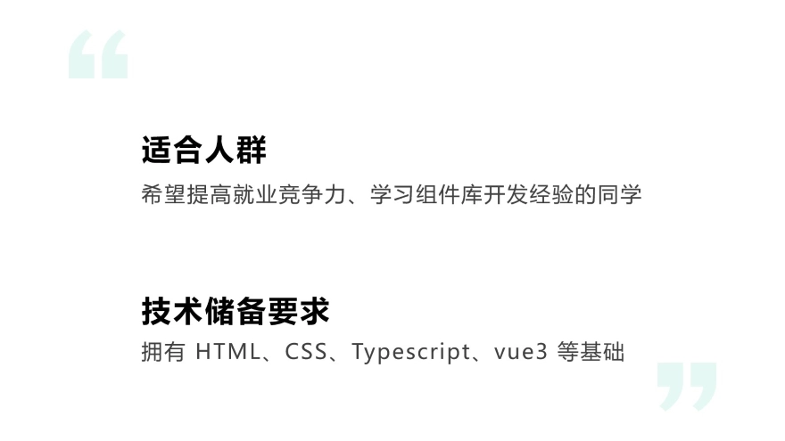 本课程引领你从零开始,全面掌握Vue3 + TS组件库开发的核心知识,包括基础架构、文档站点开发,以及UI组件库与多人协同开发的实战技能,为你在大厂岗位中脱颖而出奠定坚实基础。