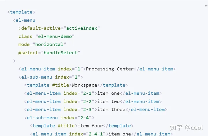 <template>   <div>     <el-container>       <el-aside width="200px">Aside</el-aside>       <el-container>         <el-header>         <el-menu     :default-active="activeIndex2"     mode="horizontal"     background-color="#545c64"     text-color="#fff"     active-text-color="#ffd04b"     @select="handleSelect"   >     <el-menu-item index="1">Processing Center</el-menu-item>     <el-sub-menu index="2">       <template #title>Workspace</template>       <el-menu-item index="2-1">item one</el-menu-item>       <el-menu-item index="2-2">item two</el-menu-item>       <el-menu-item index="2-3">item three</el-menu-item>       <el-sub-menu index="2-4">         <template #title>item four</template>         <el-menu-item index="2-4-1">item one</el-menu-item>         <el-menu-item index="2-4-2">item two</el-menu-item>         <el-menu-item index="2-4-3">item three</el-menu-item>       </el-sub-menu>     </el-sub-menu>     <el-menu-item index="3" disabled>Info</el-menu-item>     <el-menu-item index="4">Orders</el-menu-item>   </el-menu>         </el-header>                      <el-main>Main</el-main>       </el-container>     </el-container>   </div> </template>  <script setup> import { ref } from 'vue' const activeIndex2 = ref('1') const handleSelect = (key: string, keyPath: string[]) => {   console.log(key, keyPath) } </script>