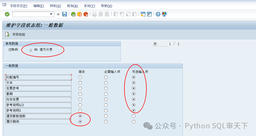 知道了系统中预设的记账码的含义后,下一步我们就要进一步搞清楚这些记账码是如何控制行项目账户类型和借贷方规则的。 这里就以常用的记账码40来说明: 我们可以看到:记账码40代表借方分录,借/贷标识为借方,科目类型为总帐科目,冲销记账代码为50。 单击维护字段状态按钮,我们可以查看每个字段组下的字段的状态设置。 如一般数据,设置了哪些字段是隐藏的,哪些字段是必须输入的,哪些字段是可选输入的。其他字段组也是一样的道理。 在实际输入凭证时,凭证行项目的字段状态是同时受记账码和科目的字段状态组控制的。如果一个字段状态组要求可选,另一个要求必输,那么最终结果将是必输,也就是说两者取最严格的。这一点尤其要注意。 点晴模切ERP更多信息:http://moqie.clicksun.cn,联系电话:4001861886 该文章在 2024/4/19 15:46:46 编辑过 |