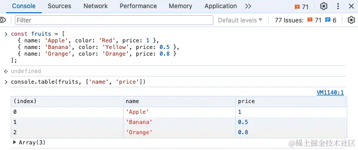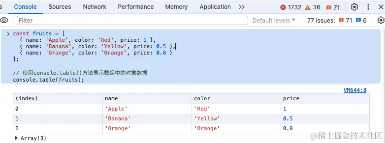 console.table在JavaScript中,console.table()方法用于在控制台中以表格形式显示数组或对象的数据。这对于可视化复杂数据结构非常有用,使数据更易于阅读和理解。
