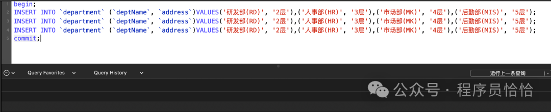 在平时我们执行insert语句的时候,可能都是一条一条数据插入进去的,就像下面这样。INSERT INTO `department` VALUES(1, '研发部(RD)', '2层'),