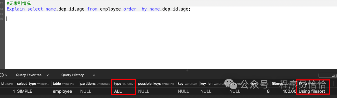 注意的是虽然我已经创建了覆盖这些列的联合索引 idx_name_dep_id_age2,但 MySQL 优化器仍然可能会决定使用文件排序(filesort)来执行这个顺序的排序操作。