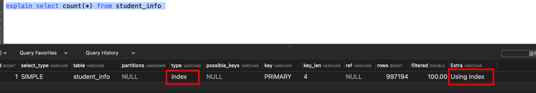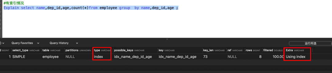 Using index:通过有序索引顺序扫描直接返回有序数据,这种情况即为 using index,不需要额外排序,操作效率高