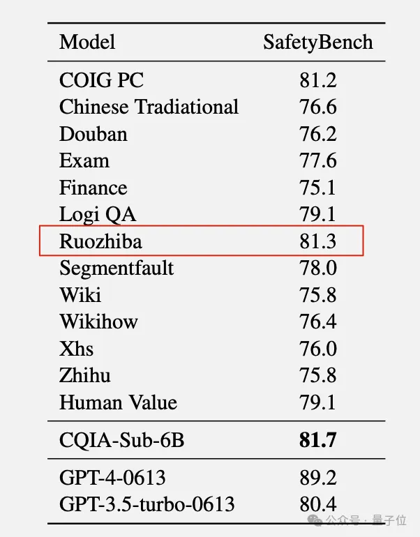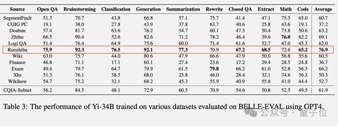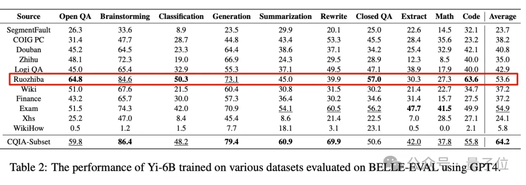 为了解决这些痛点,团队从中文互联网的各种知识源头直接收集数据,比如知乎、豆瓣、百科、小红书等,经过一系列严格的清洗和人工审核,打造成高质量、多样化的中文指令微调数据集COIG-CQIA。 除了探索不同数据源的作用,团队还专门从中抽取出一个精华子集CQIA-Subset。 在众多数据来源中,弱智吧成了最特别的一个。 由500个点赞最高的帖子标题+人工或GPT-4的回复组成指令微调数据集, 经过人工审核后,最终留下了240组指令-回复数据对。 分别用各种数据集训练零一万物Yi系列开源大模型,在BELLE-Eval测试集上使用GPT-4评分得到结果。 在规模较小的Yi-6B模型上,纯弱智吧版本总分排名第三,还不算太突出。 看来小模型还没能领悟弱智的精髓。 到了Yi-34B,弱智吧版本表现就一骑绝尘了。 只有在改写和数学任务上没能取得最高分,但成绩也比较靠前。 另外,在安全评估上弱智吧版本也能排上第二。 对于这类现象,研究人员在分析中也给出简单猜测: