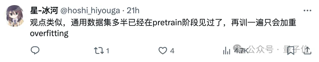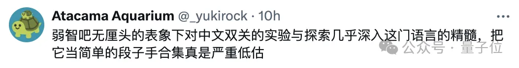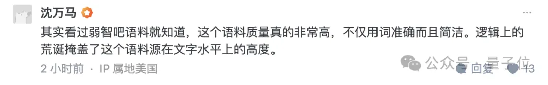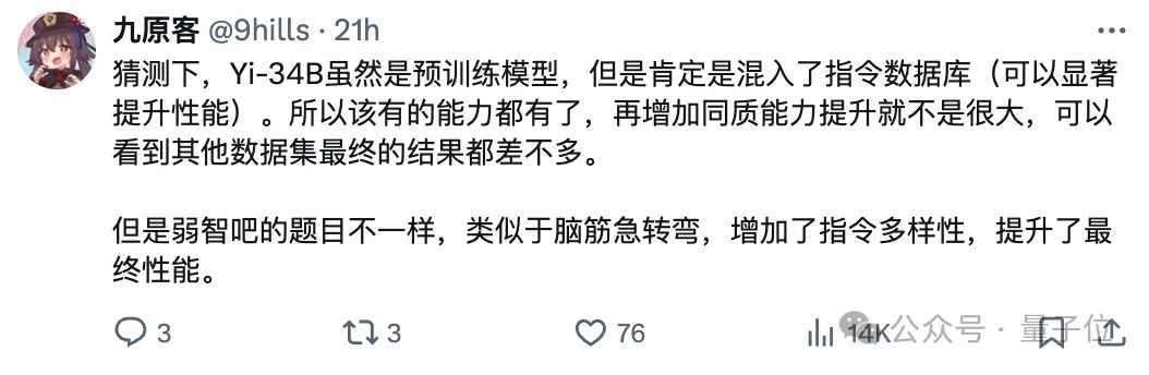 当然弱智吧并不是这项研究的全部,它的真正贡献在于为中文大模型开发提供了一个高质量的指令微调数据集COIG-CQIA。 通过对各种中文互联网数据源的探索,这项研究为构建中文指令数据集提供了很多有益的启示。比如社交媒体数据虽然开放多样,但也存在不少有害信息风险;而百科类数据专业性强,但覆盖面可能不够广。 弱智吧上大分这项研究一发,网友集体笑不活。除了“XSWL、思路开阔了”婶儿的纯围观,也有网友认真讨论起了弱智吧有如此奇效的原因。 大伙儿都比较认可的一个原因是弱智吧题目的“异质”。 像脑筋急转弯,增加了指令多样性,所以提升了模型最终性能: