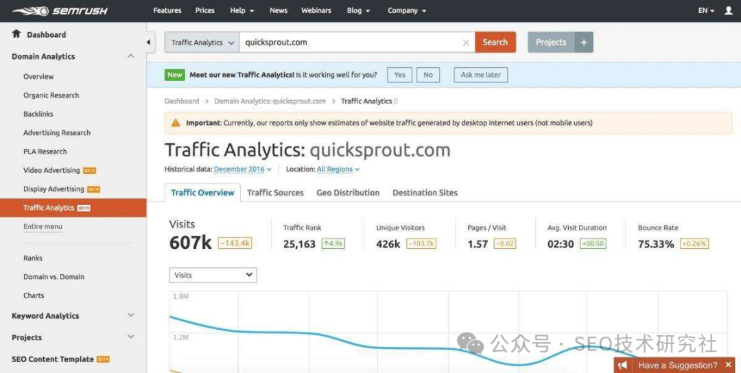 3、SEMRush一款多合一的流量分析和竞争研究工具,它是分析和监视任何网站流量的实用工具。 优点: (1)数据覆盖面广,它提供了全球范围内的搜索引擎数据,用户可以轻松地进行关键词研究,并监测自己的排名变化; (2)提供了竞争对手分析工具,用户可以了解竞争对手的关键词策略和广告活动,从而优化自己的营销策略。 缺点: (1)价格贵,对于个人用户来说可能有些昂贵; (2)数据庞大且复杂,初学者可能需要一些时间来适应和理解其中的各种指标和报告; (3)解决问题的能力有限,用户还需要结合其他工具和策略来获得更好的效果。