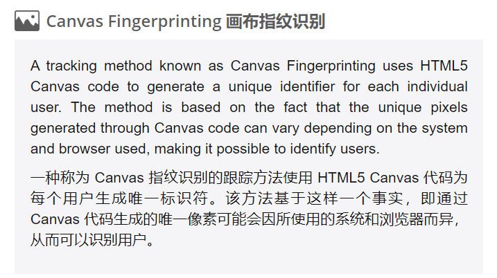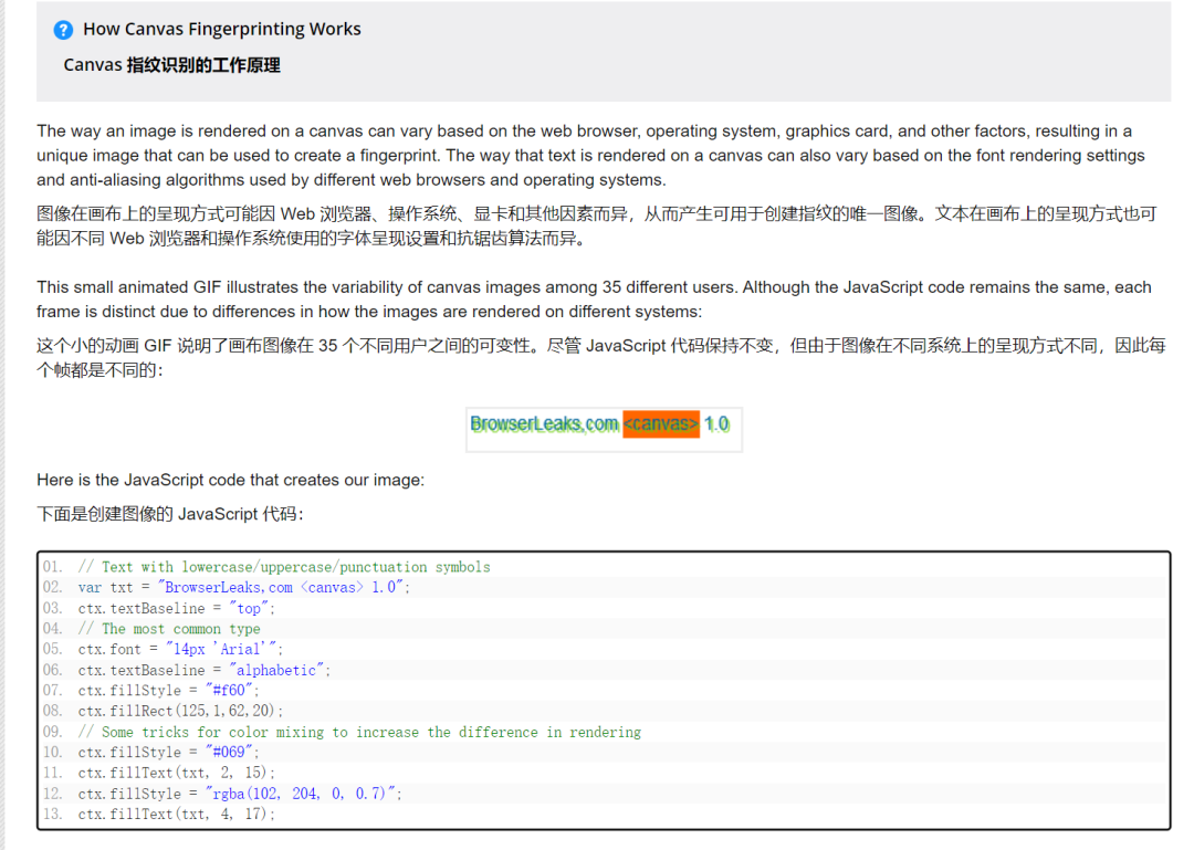 就比如使用 canvas 去计算浏览器指纹,通过介绍可以粗略知道,这是一种使用 canvas 画布去进行计算的指纹算法