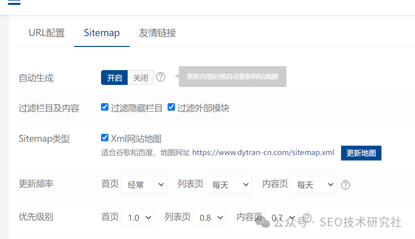 在CMS管理后台的sitemap配置信息:开启自动生成新网址、开启sitemap功能、