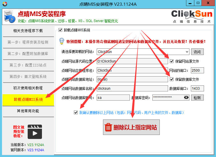 :请问如何在服务器上彻底卸载点晴OA系统?![]() 点晴OA系统在服务器上其实就是一个网站,可以采用手工删除或自动删除两种方式彻底删除点晴OA系统。 方法一:手工删除 1、删除网站 进入点晴OA系统所在服务器,打开IIS管理器,找到点晴OA系统所在网站,点击鼠标右键删除此网站: 2、删除数据库 打开SQL Server 管理器,找到数据库ClickSun,点击鼠标右键删除: 3、删除网站代码和数据库目录 打开资源管理器,删除目录:D:\ClickSun和D:\ClickSun_DB,如果不是安装在此位置,则删除实际安装位置所在目录及其所有文件即可。 方法二:自动删除 下载(附件:地址)并打开点晴OA系统安装程序: 点击左边的菜单“卸载点晴MIS系统”,选择要删除的网站,默认是“ClickSun”,如果不需要保留网站代码和数据库文件,则不要勾选“保留网站源文件”和“保留数据库文件”,勾选“我确认要删除以上网站”,然后点击“删除以上指定网站”,就可以彻底点晴OA系统了。 该文章在 2025/5/6 8:28:38 编辑过 |