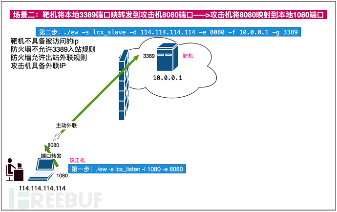 场景二攻击机侧运行工具,做1080端口转发本地8080端口,且8080端口接受外部连接;靶机将本地3389端口数据转发到攻击机8080端口;