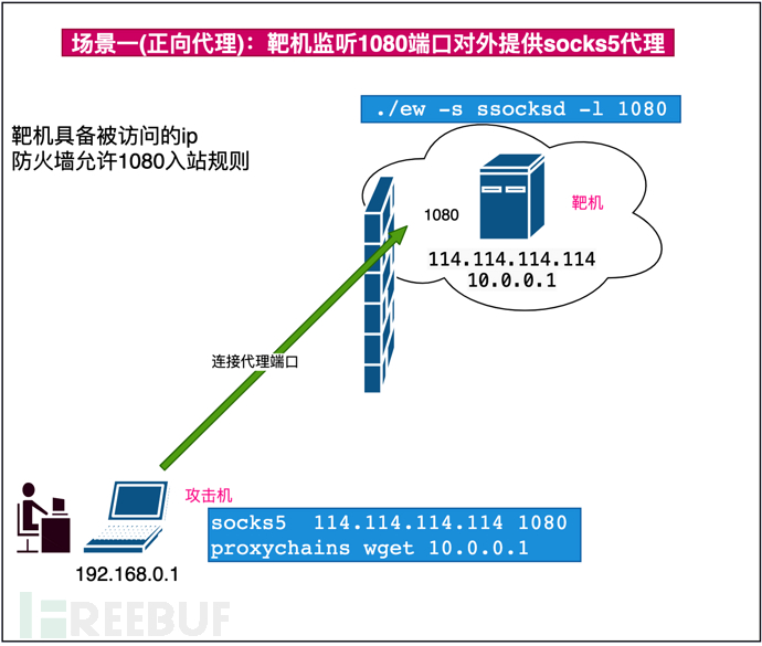三、socks5代理功能场景一(正向代理)在靶机侧运行工具监听1080端口对外提供socks5代理服务;在攻击机侧使用代理工具(例如:proxychains)连接靶机提供的socks5代理服务,继续渗透扫描内网。