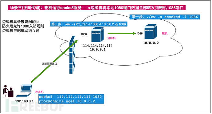 场景三(正向代理):靶机侧运行工具启动socks5服务,边缘机侧运行工具将本地从1080端口收到的数据全部转发到靶机1086端口,在攻击机侧使用代理工具(例如:proxychains)连接边缘机提供的1080端口;最终达到攻击机侧与靶机之间形成socks5代理通道,继续渗透扫描内网。