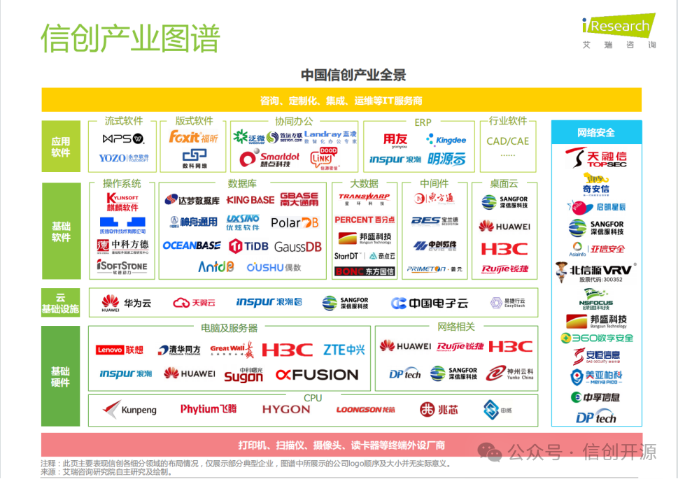 “信创”(全称“信息技术应用创新”)是国家基于国产芯片和操作系统的PC、服务器、网络设备、存储设备、数据库、中间件等基础设施的技术创新。 信创关系网络安全和国家安全,一直以来受到国家大力支持和推动,经历了四个发展阶段。 一是雏形起步阶段(2006-2013):2006年国家启动核高基战略,我国的自主芯片雏形初现,基础软硬件实现零的突破。 二是初步试点阶段(2014-2017):2014年国家网络安全与信息化领导小组成立,2016年信创工作委员会成立,该阶段国家选择15家单位开展党政信创工程第一批试点;在小型机领域,金融行业出现去IOE(IBM主机、Oracle数据库、EMC存储)信创案例。 三是规模化试点阶段(2017-2019):2017年全国网络安全与信息化工作会议召开,党政信创工程第二期试点启动,100余家单位开展试点,2019年党政信创工程二期试点完成。该阶段飞腾、鲲鹏、龙芯、申威、兆芯等多路线快速突破,基础软硬件从无到有,党政信创快速推进,产业生态逐渐丰富。 四是全面应用推广的新阶段(2020-2023):2020年党政信创三期开始招标,党政信创确定三年完成的计划表,并由党政信创为主,向金融、医院、教育、航空航天、石油、电力、电信、交通等重点行业领域全面推广。新阶段出现飞腾2000+、鲲鹏920、麒麟操作系统V10等自主安全基础软硬件最新成果。 国务院印发的《“十四五”数字经济发展规划》中,十四五数字经济发展主要指标明确指出到2025年行政办公及电子政务系统要全部完成国产化替代。 2022年9月底国资委下发79号文,全面指导国资信创产业发展和进度。政策要求所有央企国企在2022年11月份基于计划上报替换的系统,2023年每季度向国资委汇报。到2027年央企国企100%完成信创替代,替换范围涵盖芯片、基础软件、操作系统、中间件等领域。 我国信创行业已基本建立起从上游芯片到下游应用的替代产业链条。从产业链角度看,信创生态体系主要由基础硬件、基础软件、应用软件、网络安全几部分组成。所涉及领域包括硬件方面(整机、服务器等);软件方面(操作系统、数据库、中间件等);上层应用方面(办公软件、ERP等;网络安全方面,如边界安全产品、终端安全产品等)。其中芯片、整机、操作系统、数据库、中间件是最重要的产业链环节。 *图片来自艾瑞咨询 从行业下游应用角度看,信创涉及党政两大领域及金融、石油、电力、电信等八大行业应用,以及更下游的诸多应用场景。当前国内信创正沿着“2+8+N”方向加速普及。从推进进程来看,党政信创启动最早。国内党政信创从2013年开始逐步进行公文系统替换计划,预计2022年完成基本公文系统信创改造,23年逐步启动电子政务系统国产化替代,市场规模更大。八大重点行业中,金融行业信创推进速度最快,电信紧随其后,之后是能源、交通、航空航天,教育、医疗也在逐步进行政策推进和试点。最后,N个行业的信创2023年已开始启动。