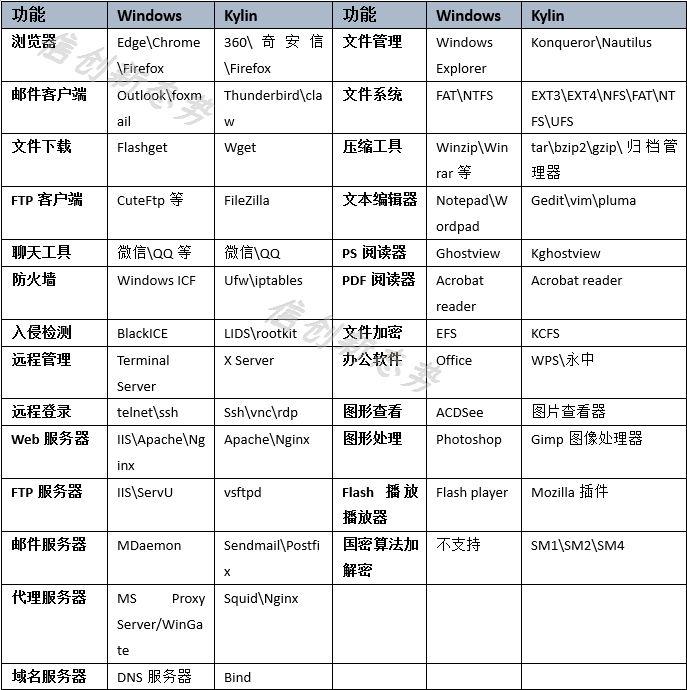 而麒麟操作系统是使用 Linux 内核的同时吸收openEuler的一种操作系统,集成自主研发的 UKUI3.0 桌面应用系统,使以往复杂的 Linux 操作变得更加容易,此外麒麟提供了 GUI、shell 和许多实用工具,便于用户运行程序、管理文件。 02 国产主流操作系统基本把windows系统作为自己产品追赶目标,而银河麒麟操作系统是国产自主可控的基础软件之一,与微软操作系统有许多不同之处,笔者主要从主要区别和主要功能来对比: