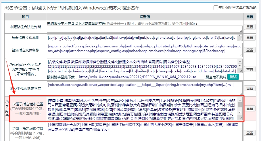 找到“IP属于指定城市位置”,将所在国外的国家名称删除即可。不要全部清空,全部清空的话,系统又会自动设置为预置值。