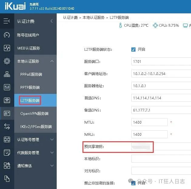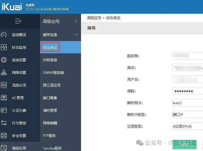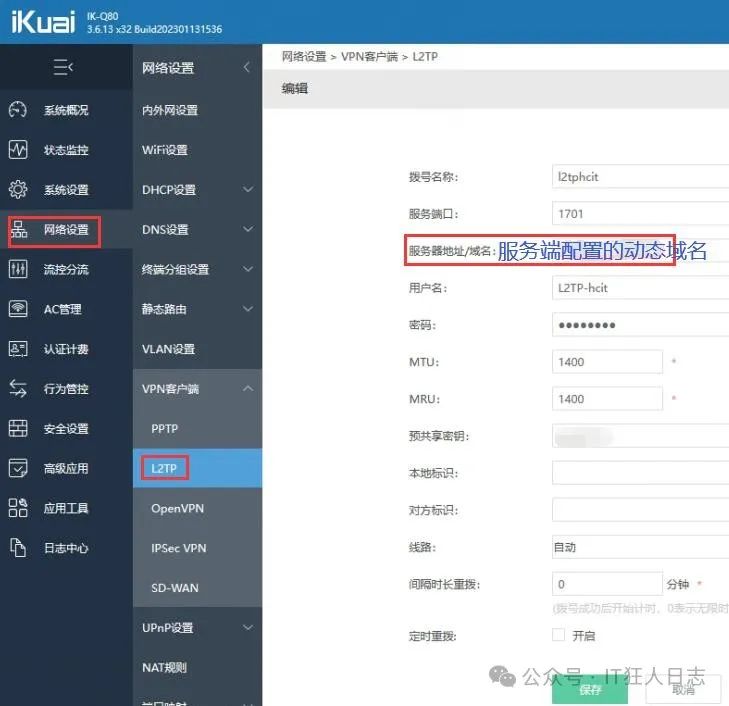 步骤五:配置L2TP客户端 注意,下面的配置,是在客户端的爱快路由器里操作的,别搞混了。 在“网络设置”里面找到“L2TP”,主要是输入服务端的动态域名、L2TP的用户名和密码、预共享密码这几个关键参数,然后保存。