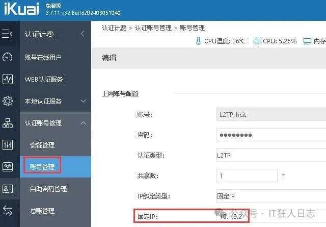 步骤二:创建L2TP账号。 在“认证账号管理”中创建一个账号,用于客户端远程拨入,由于客户端也是一台爱快路由器,所以此处分配一个固定的IP地址,如果是给笔记本电脑用户分配的远程拨入账号,则不指定固定IP。