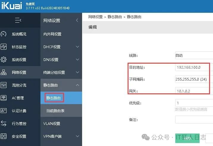 步骤三:在服务端配置静态路由 目的地址,此处指客户端内网网段,即:192.168.100.0/24;网关填写为上一步为客户端分配的固定IP:10.1.0.2