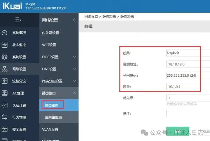 步骤六:在客户端配置静态路由。 与步骤三相对应的,这里要写一下到服务端的静态路由,注意:线路选择L2TP线路,目的地址是服务端的内网网段,此处为:18.18.18.0/24,网关配置为服务端的L2TP服务器IP:10.1.0.1。