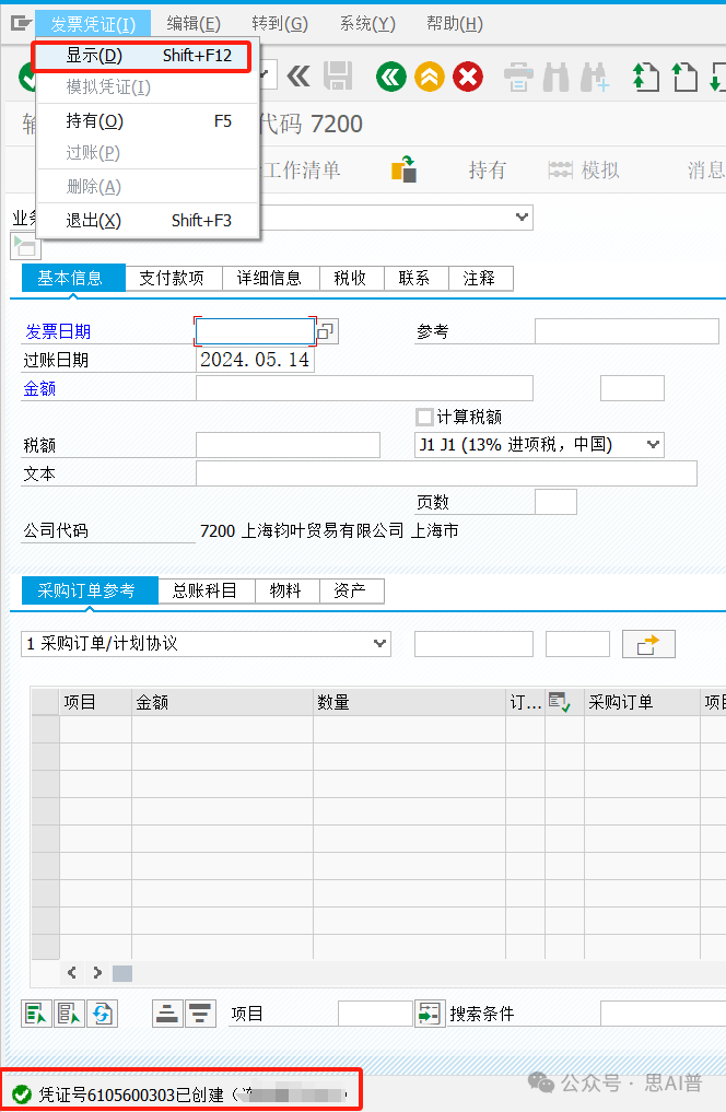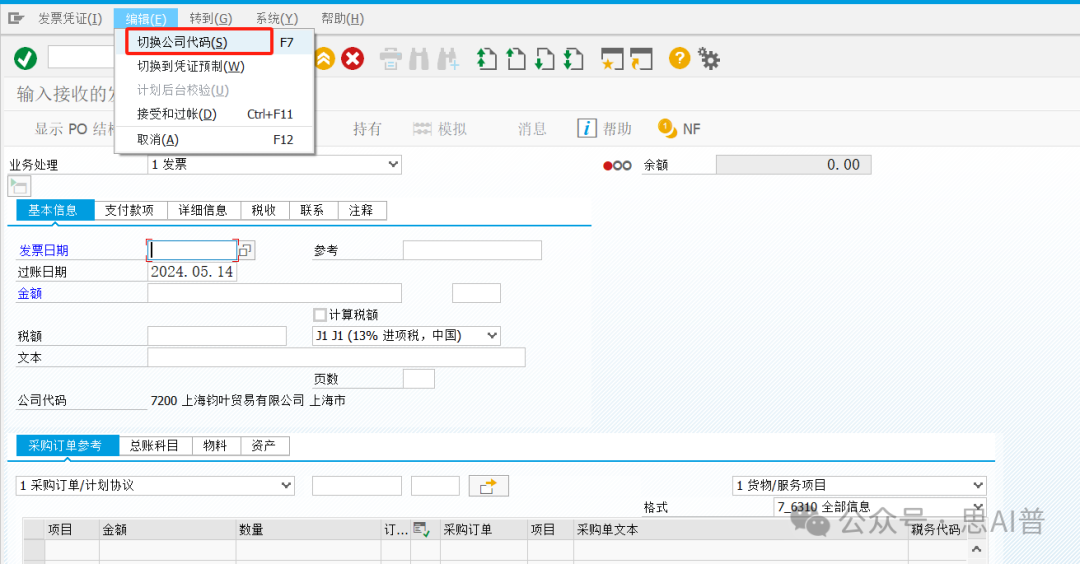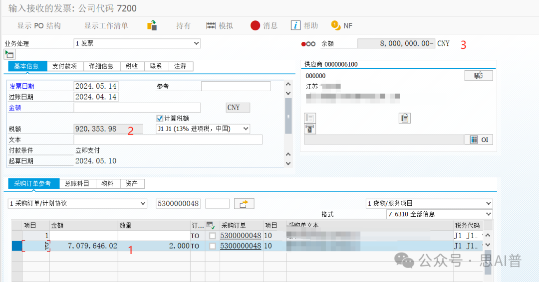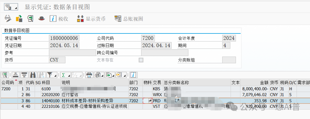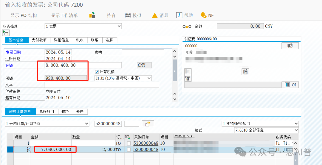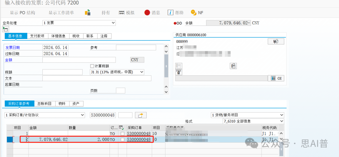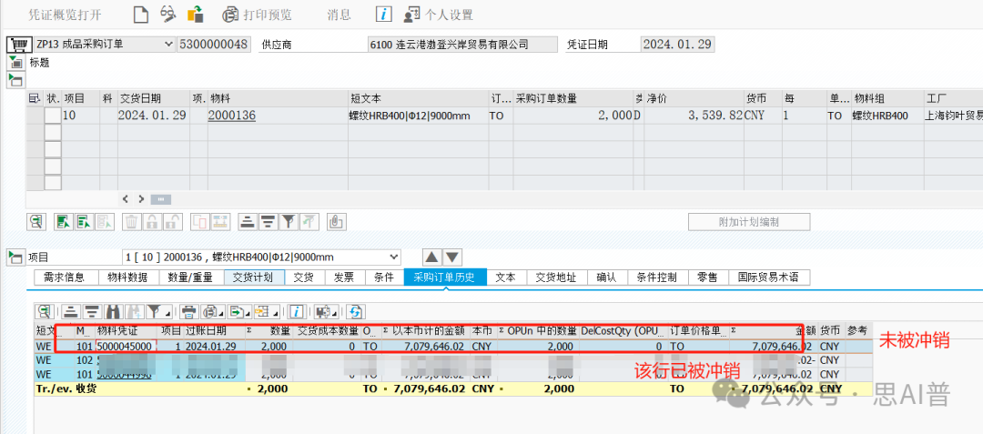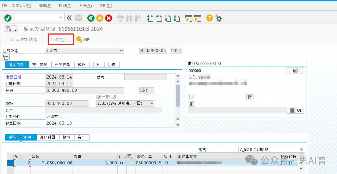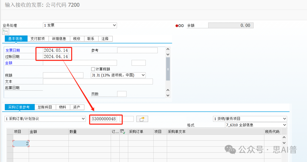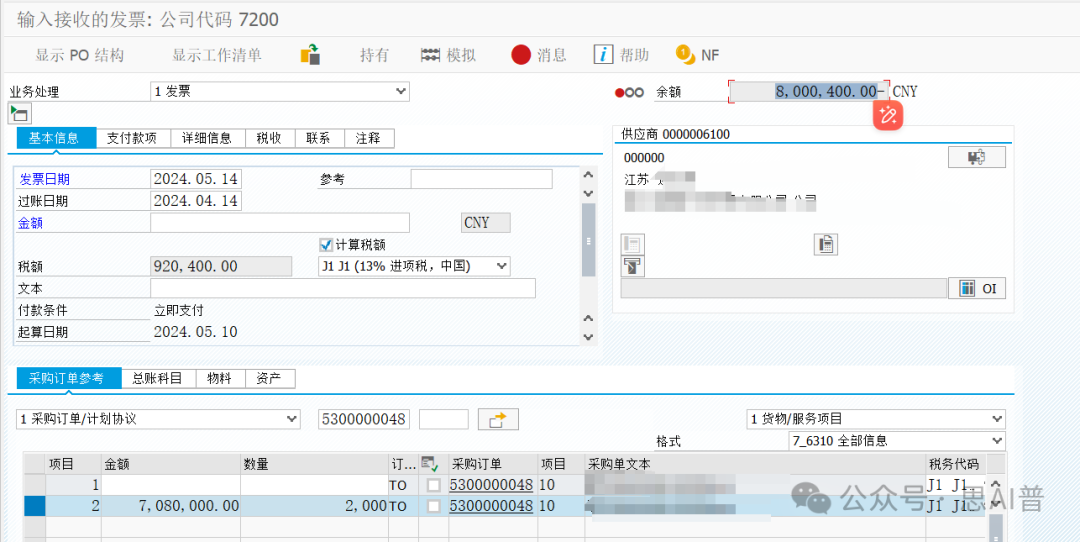 一、采购订单收货暂估凭证 采购订单情况:采购订单号码5300000048 采购单价PBXX总价是含税单价,不含税单价是3,539.82 订单计划数量:2000吨 没有其他附加的费用(价内和价外) 本次收货数量:2000吨,暂估金额按照不含税单价*收货数量来,金额7,079,646.02,如下图,生成相应应付暂估会计凭证 由于物料是标准价格的物料,所以物料科目多出来一个差异科目 借:14059904 库存商品-XXX 为 物料标准价格*收货数量 贷:22020200 应付暂估 为 物料采购价格*收货数量 贷/借:14040100 材料成本差异-材料采购差异 为物料标准价格和采购价格差异 * 收货数量 二、MIRO发票校验 如果你有多个公司的权限,进来系统没有提示你输入公司代码,需要点这里检查当前界面的公司是否和发票对应。 这里输入日期之后,输入采购订单号码 系统会自动带出来采购订单未发票校验的行项目,这里要注意的是如果发票有启用预制的功能,预制过的行也会再次出来,已经过账的行就会和项目1一样,没有对应数量和金额。 这里进一步核对进项发票和收货暂估的时候一致,可以点击计算税额 然后输入基准日期,应付账款账龄计算用。 这里会有三个金额,金额1:采购订单价格*收货数量=应付暂估金额=货物价值 金额2:税额,根据金额1*税码计算 金额3:含税金额=金额1+金额2 如果此时发现不一致的情况,我们可以模拟此情况进行分析暂估冲销的情况,如原暂估金额为7,079,646.02,由于采购输入的价格或结算折让等原因金额变成了7,080,000.00,货物价值应该是这么多。 那我们就可以直接修改,修改完成之后需要重新计算税额:去掉勾选,重新勾选,下图重新计算后 凭证 我们过账之后来检查整体凭证的生成情况,过账完接着点显示即可。 点击后继凭证 贷:预付账款8,000,400.00- 借:应付暂估7,079,646.02 借:材料成本差异-材料采购差异353.98 借:应交税费-应缴增值税-待认证进项税920,400.00 我们首先发现多了一个借方材料成本差异-材料采购差异 353.98 这个金额就是我们前面修改的金额7,080,000.00-7,079,646.02=353.98 暂估少的金额,发票校验的时候重新计入了差异,计入了物料价值,如果跨期做发票校验,恰好这个物料又没有了库存,就导致了发票校验的差异。 借:应付暂估金额为7,079,646.02 ,此时冲销了原来暂估的金额。 关于FALGB03去查询的问题,如果采购订单多行去发票检验,我们一般会进行配置相同订单号+行项目进行汇总会计凭证行,不至于发票校验行超过999,“报FI消息号F5727,在FI中达到的项目最大编号,已超过FI凭证('999')的项目最大“。 这时候会导致生产的凭证,应付暂估会合计到一起,差异科目按物料,应付账款有一行,税一行的情况,但是在FAGLB03配置选择不汇总,仍可以按照不同工厂和物料查询。 如凭证只有一行应付暂估 FAGLB03有多行,同时发现发票冲销的暂估金额<>原收货暂估金额? 点晴模切ERP更多信息:http://moqie.clicksun.cn,联系电话:4001861886 该文章在 2024/5/22 16:32:06 编辑过 |