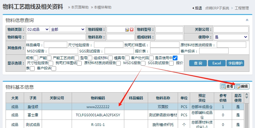 ![]() ![]() 按照提示操作,进入工程管理-》工艺资料管理: 找到需要维护的物料编辑即可: 如果看不到上面的菜单,那就是没有权限,找管理员开放权限,或者找有权限维护的同事操作即可。 点晴模切ERP更多信息:http://moqie.clicksun.cn,联系电话:4001861886 该文章在 2024/6/1 15:22:01 编辑过 |