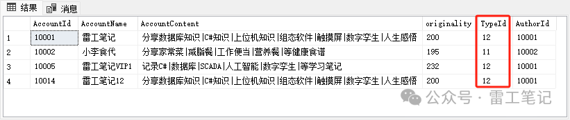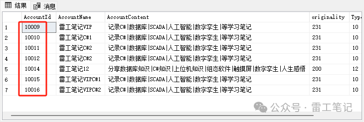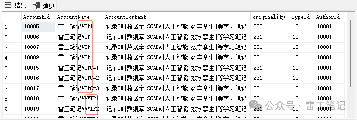 将账号名称为“雷工笔记”、“雷工笔记C#1”、“雷工笔记VIP”的信息查询出来。