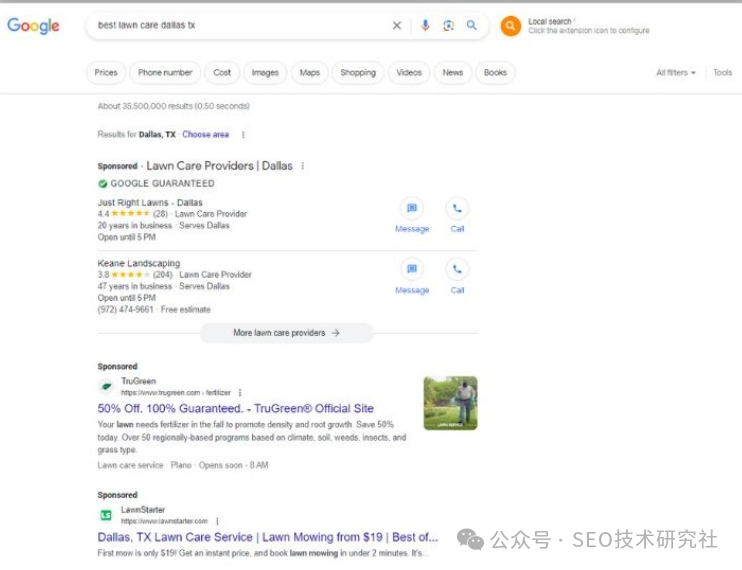 那是因为这些搜索者现在不一定想聘请园艺师。因此,如果您花钱通过 PPC 广告获得这些点击,就很难赚回您的钱。SEO 是这些信息关键词的最佳选择。 让我们翻转一下,看看“best lawn care Dallas TX”的结果。