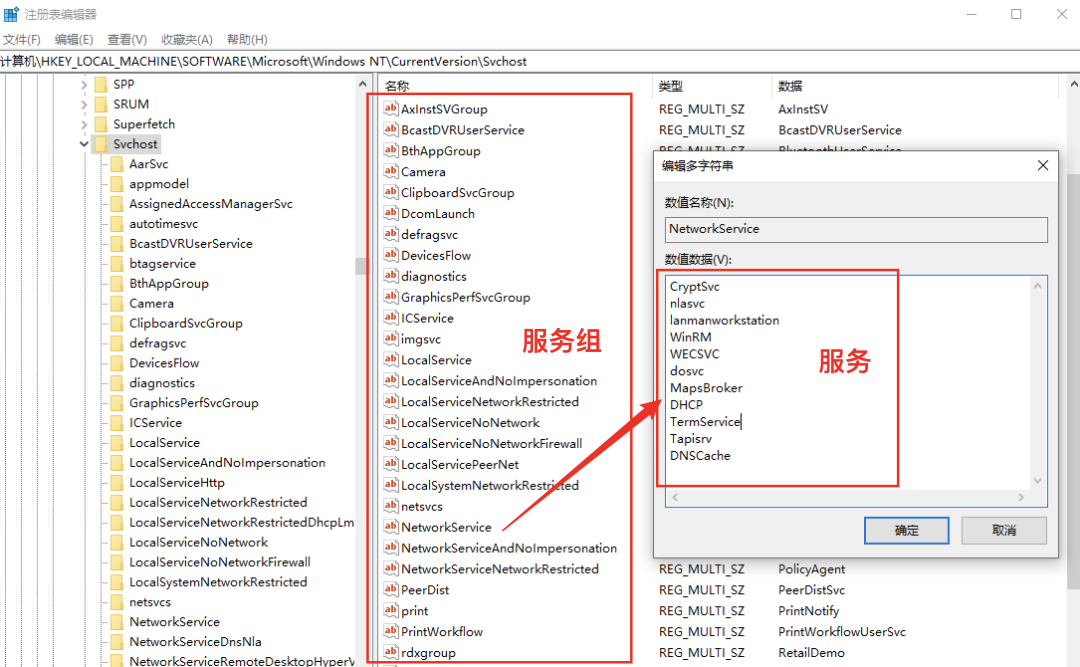 svchost 注册表项对服务进行分组管理,只要是需要 svchost.exe 去启动的服务,都要放在这里。