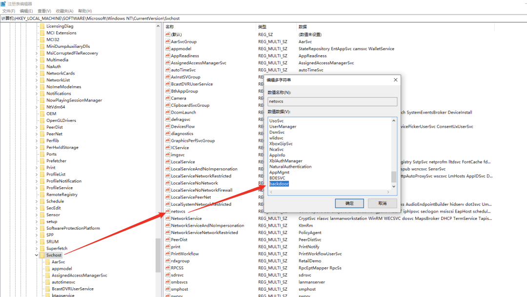 - 在 svchost 注册表项中将要启动的后门服务放置到现有服务组中或者新建一个服务组;