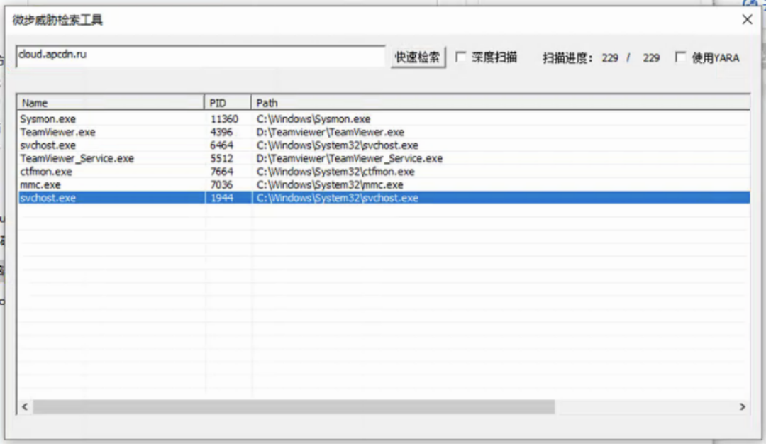 通过火绒剑进程监控发现 svchost.exe 进程请求恶意域名其次,还可以使用一些内存字符串搜索工具,来定位存在恶意域名/IP字符的可疑进程。(此类工具可能会定位到其他无关进程,需要对进程有一定的辨别能力);
