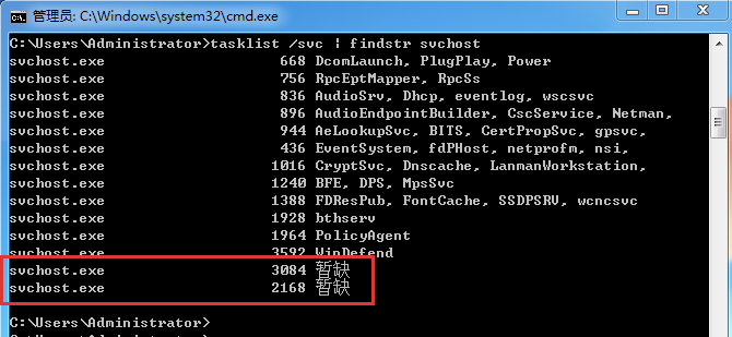 对付一些仿冒 svchost.exe 的恶意程序,我们可以通过 tasklist 命令来查看每个 svchost.exe 启动的服务,如果某个 svchost.exe 对应的服务显示“暂缺”,就说明该进程所提供服务对应的 dll 存在缺失,这种情况说明该进程大概率就不是给我们系统提供服务的进程,只需根据 PID 对应具体的进程信息,查看可执行文件路径,然后通过沙箱等方式判断是否为恶意程序。