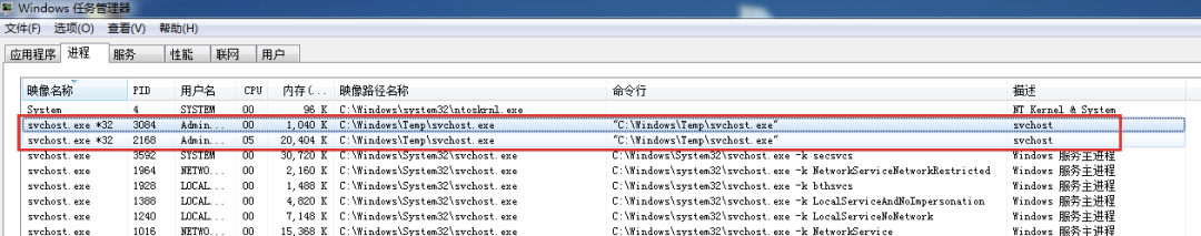 这类手法比较低级,很容易被分析人员识破,算是上古时期的利用手法了,现在偶尔也能碰到。主要通过名称或者路径混淆来伪装自己:一种是将与 “svchost.exe” 相似名称的木马文件放置在系统路径下;另一种是在其他系统路径下放置恶意的 “svchost.exe” 文件。