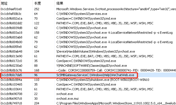 查看 svchost.exe 进程内存,发现 IOC 字符串其次,我们可以进一步对该进程进行内存转储 dump 然后进行分析,常用的任务管理器、火绒剑和 Prodump 等工具都可以执行内存转储操作,这类 Dump 可以将目标进程的数据区、堆栈信息以及线程等信息保存到 .dmp 文件,针对转储的 .dmp 文件,最直观的方法就是使用 windbg 等工具直接查看其线程、句柄以及字符串等信息。更进一步,还可以使用 PEDump 等工具将目标进程加载的文件进行转储,这类 Dump 的结果是 PE 文件,可以使用 IDA 或 OD 等工具深入分析,尝试提取其注入的 PE 文件或 shellcode。dump 出 svchost.exe 内存分析发现可疑 Wechatweb.exe 程序进程替换技术实现的傀儡进程为恶意代码提供了和其他进程一样的特权,恶意进程看起来就是一个合法进程,但是它在内存中的镜像会和磁盘上的不一样,而我们使用的ProcessExplorer等工具来验证签名是对磁盘上的文件进行验证,所以一个傀儡 svchost.exe 进程可以通过微软的验证,但他实际上是个恶意程序。特别鸣谢微步应急扛把子“乔峰扛着音响来了”对笔者的技术指导,本篇文章旨在带大部分入门应急响应的小伙伴了解 svchost.exe 进程及背后的机制,以及在应急响应实战中如何分析的一些小技巧,希望能对大家带来帮助。