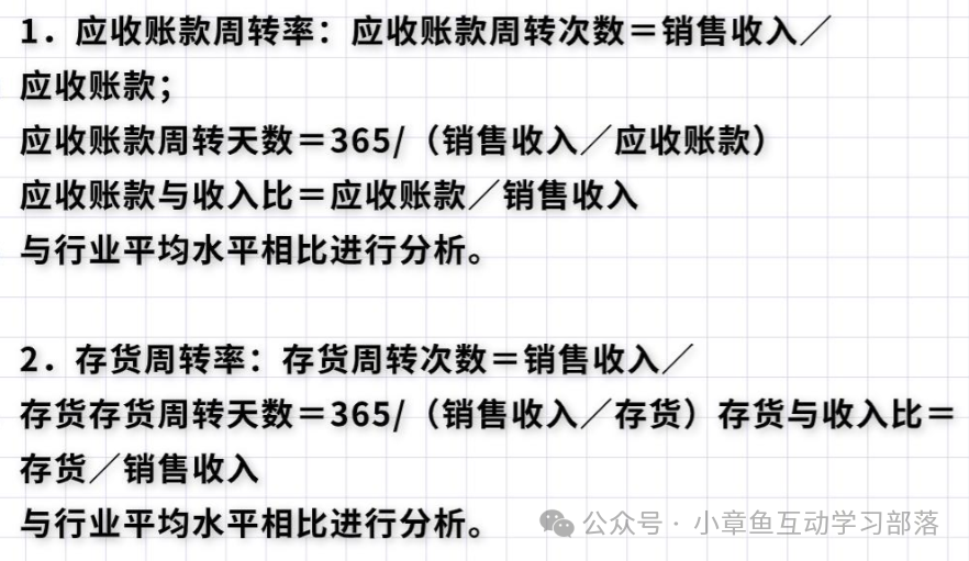 1.应收账款周转率;2.存货周转率;3.资产周转率。