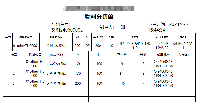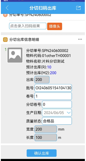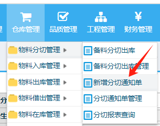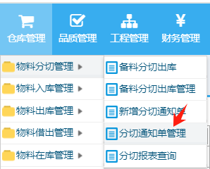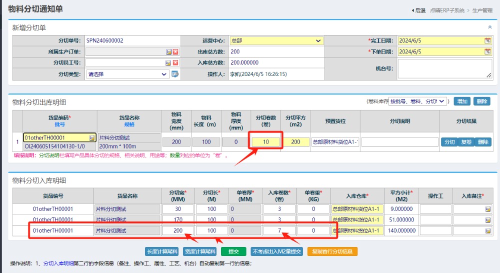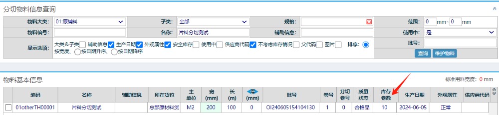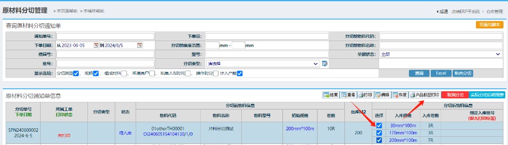 仓库管理-物料分切管理-新增分切通知单 进入界面选择对应的库存 选择过来会带上所有的合并卷数 点击分切,注意分切资料需要将剩余不变的片料记录上去。