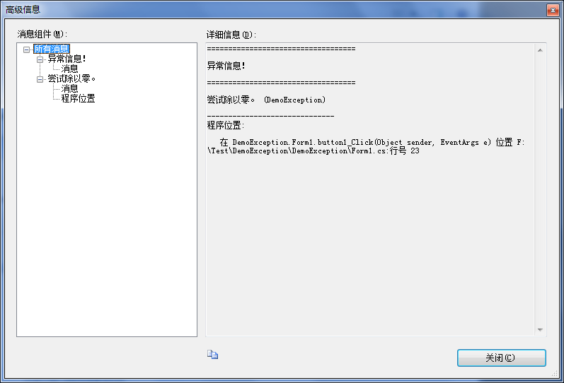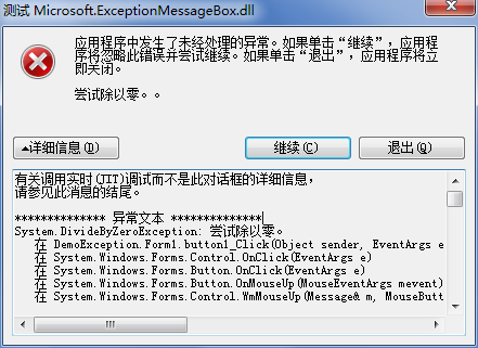上图中虽然提示出“尝试除以零”的异常信息,但是“详细信息”按钮下显示的具体提示信息显示的不是很友好。